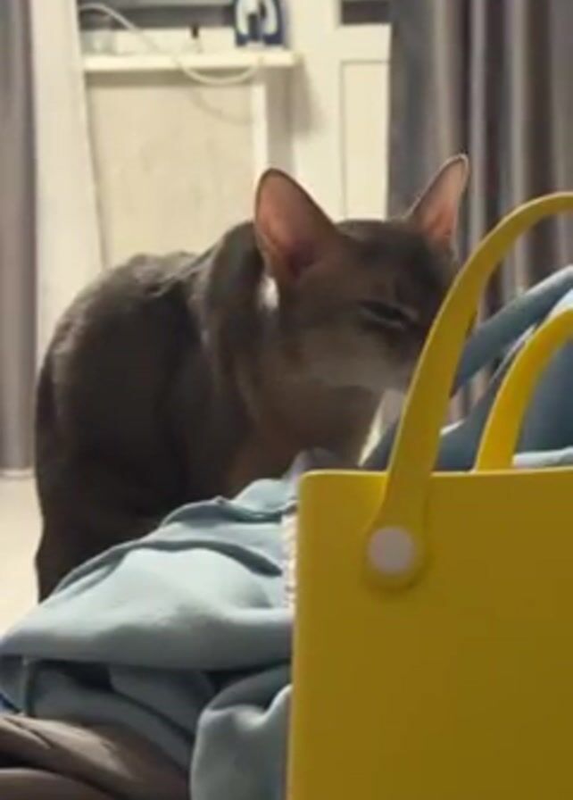 gray Abyssinian cat sitting on a pile of blue and gray folded clothing. A yellow tote bag with white accents is positioned in the foreground, partially obscuring the cat. In the background, there is a window with white frames, gray curtains, and an iron resting on a white surface. The cat appears to be sniffing at the clothes, then looks toward the camera. A "ksksks" sound is heard, presumably from the cat.