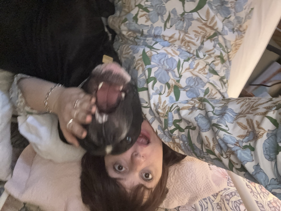 The image displays an indoor scene featuring one person and one dog in close proximity. A female individual with dark hair and bangs is visible on the left side of the frame, lying down and looking towards the camera with wide eyes and an open mouth. She wears a garment patterned with blue irises and green/brown foliage. Her right hand, adorned with a silver-colored chain bracelet and at least two rings, rests on the head of a dark-furred dog, likely a brachycephalic breed, whose mouth is open wide, exposing pink gums, tongue, and teeth. A small, light-colored tag is visible near the dog's collar. The dog's head is positioned immediately adjacent to the person's face. Background elements include a light pink quilted pillow or blanket near the person's head and additional patterned fabric. The specific location within the city of Atlanta, United States, cannot be determined from the visual content of the image.