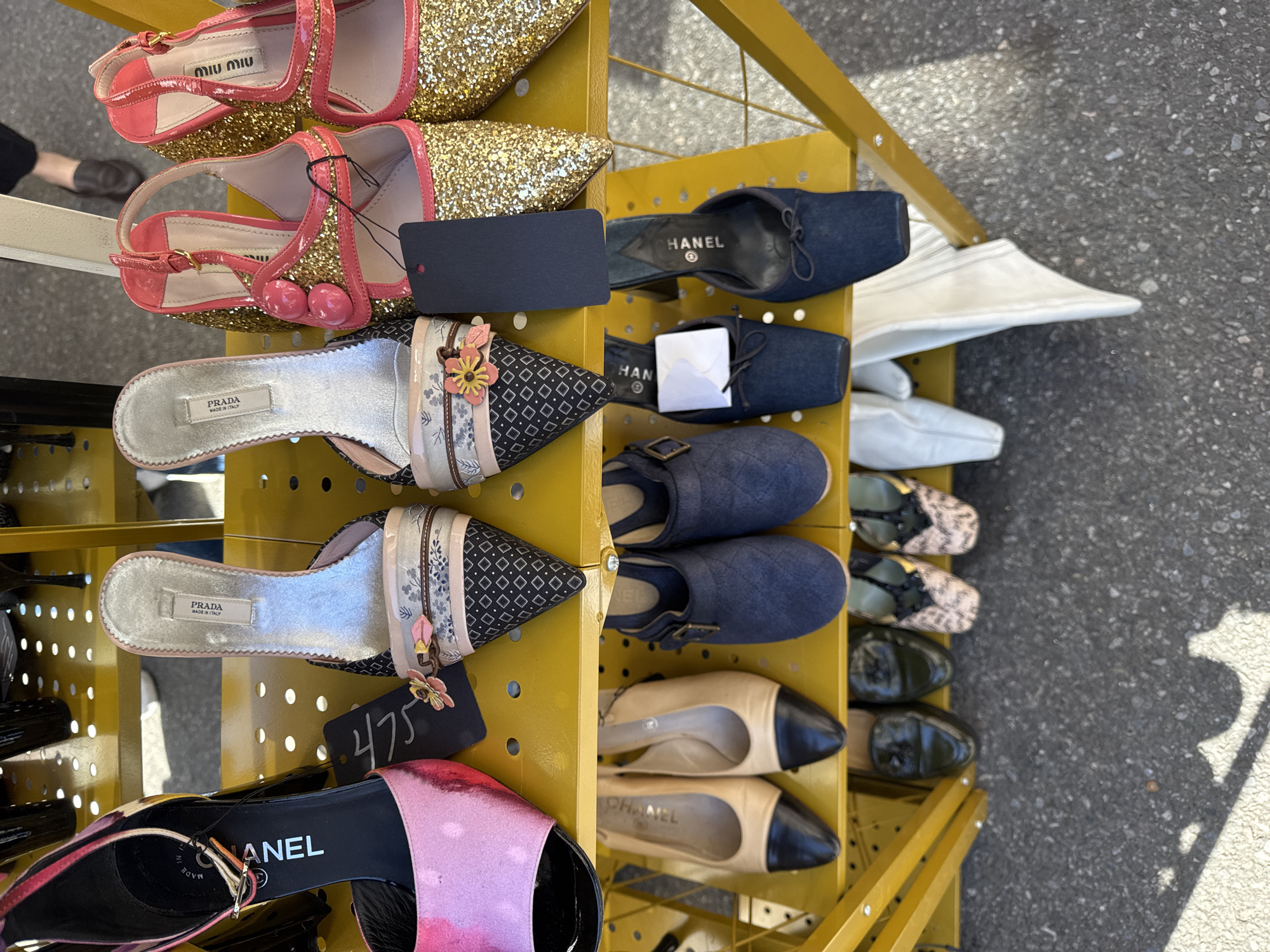 A vertical close-up shot shows a shoe rack filled with designer shoes. Brands visible include Miu Miu, Prada, and Chanel. The rack is made of a mustard yellow metal. The shoes vary in style, including glitter sandals, patterned mules, denim clogs, and classic Chanel pumps. A price tag of "475" is visible on one of the shoes. The background is slightly blurred, showing a paved surface. The scene's location in New York City, USA, is not explicitly discernible from the image alone.