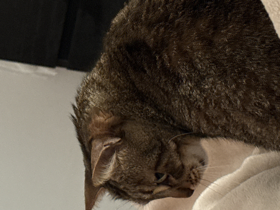 A domestic tabby cat is observed in a close-up, left-side profile within an interior location in Palma de Mallorca, Spain. The animal's head is oriented towards the left and angled downwards. Its coat displays a brown and black brindle pattern with lighter fur visible on the inner ear and around the muzzle. The cat rests on a light-colored, textured fabric, consistent with a blanket or upholstery. The background consists of a light-toned wall section on the left and an opaque dark object, possibly furniture or an electronic device, on the right. No human subjects or interactions are present. The scene is illuminated by diffuse indoor light.
