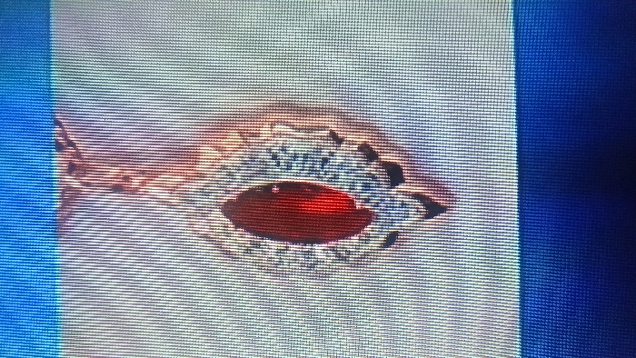 A ring with a large, oval red stone is centered in the image. The band of the ring is adorned with intricate, perhaps filigree, details. The ring appears to be set against a white, textured surface, possibly fabric. A portion of the frame is occupied by a solid blue area to the right and a lighter blue area to the left. The overall image quality is slightly grainy.