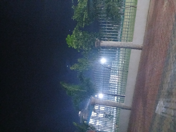 The scene is captured at night within Thika Township ward, Kenya. The foreground displays an uneven, reddish-brown ground surface, possibly a dirt or gravel path, with an indistinct light-colored object partially visible in the lower-left corner. A dark metal fence, composed of vertical bars, is situated upon a light-colored concrete base wall. This fence features at least two decorative concrete pillars, one prominent pillar appearing to the right of the frame's center. Behind the fence, a well-lit grassy area is visible, containing multiple trees with green foliage. Bright artificial lights illuminate this interior space. In the background, on the far left, a multi-story building with illuminated windows and a light-colored facade is partially visible. The sky overhead is dark. No individuals or discernible activities are present.
