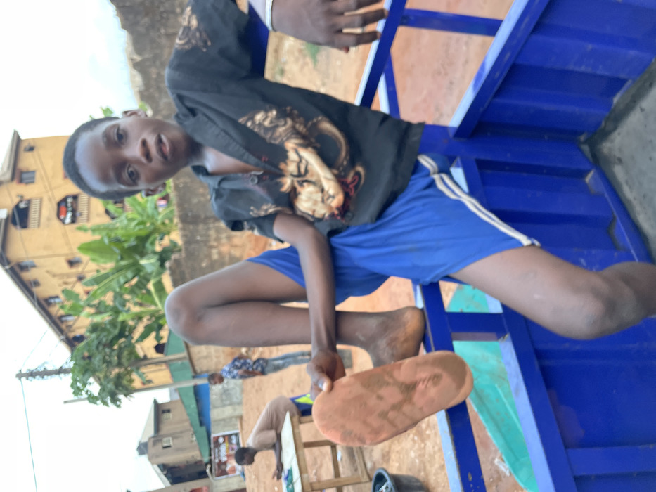 A barefoot child sits on the edge of a blue cart, holding a worn, dusty sandal. The child wears blue shorts with white stripes and a dark, patterned shirt. In the background, other people are visible along with buildings and greenery. One person is bent over a table, while another is standing nearby. The overall setting appears to be a casual outdoor environment.