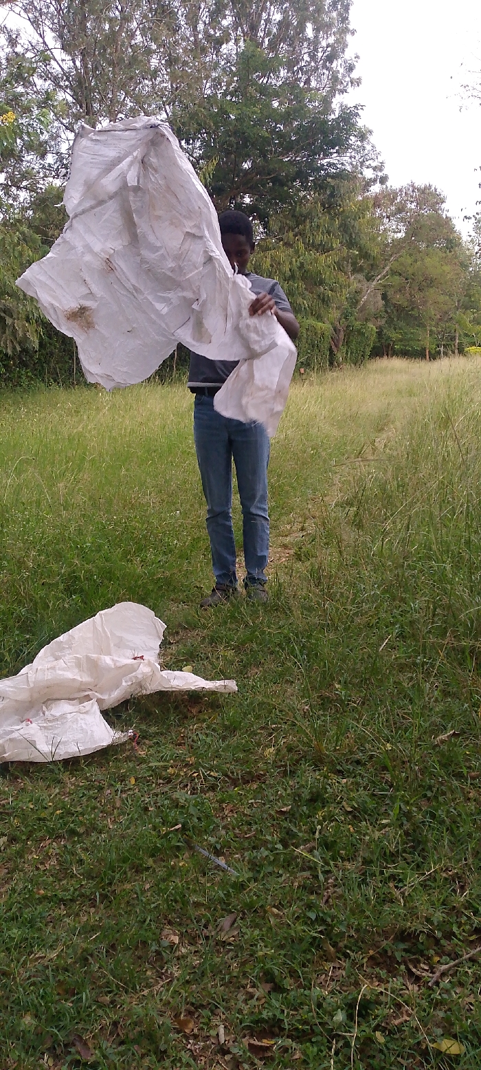 An individual is depicted standing in a grassy field in West Sakwa ward, Kenya. The person, appearing male, is wearing a dark grey short-sleeved shirt, blue jeans, and dark footwear. They are positioned centrally, actively manipulating a large, crumpled white fabric object with both hands, holding it upright. This object exhibits creases and minor discoloration. A separate, smaller section of similar white crumpled fabric, with visible red elements, lies on the green grass in the lower-left foreground. The background consists of tall green grass and a dense line of mature trees under an overcast or bright sky.