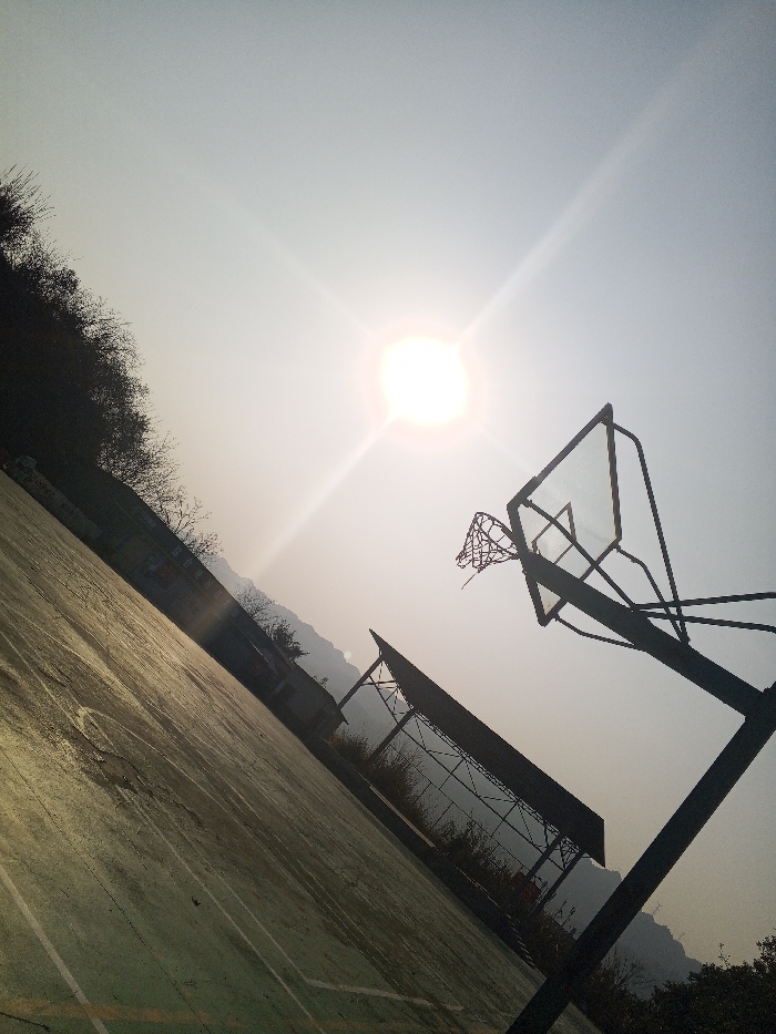 The image displays an outdoor basketball court in Jiangjin, China, captured from a low, upward-angled perspective. The scene is dominated by a bright, flaring sun positioned high in a hazy, pale sky, casting strong light across the environment. In the foreground, the concrete court surface is visible, appearing aged with a worn green coating and faded white lines. To the right, a basketball hoop structure stands prominently, silhouetted against the bright sky. It features a clear backboard and a metal rim with a damaged or partially disintegrated net. Further into the midground, another dark, angled structure, possibly a second basketball hoop or a shelter, is visible. On the left side, beyond the court, dark, sparse vegetation and a small, nondescript building are present. Hazy mountains or hills form the distant background. No individuals are visible on the court or in the surrounding area.