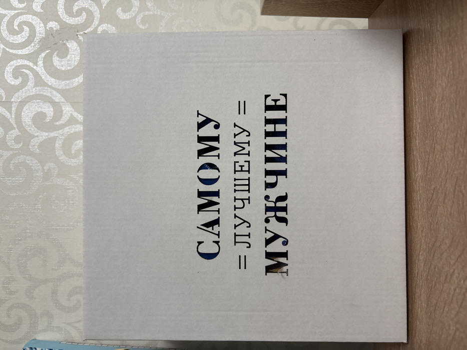 A white box displays the phrase "САМОМУ = ЛУЧШЕМУ = МУЖЧИНЕ" in bold, vertically aligned, black text. Some letters show a subtle blue hue within them. The box rests on a patterned surface and is partially situated next to a wood-grained surface.