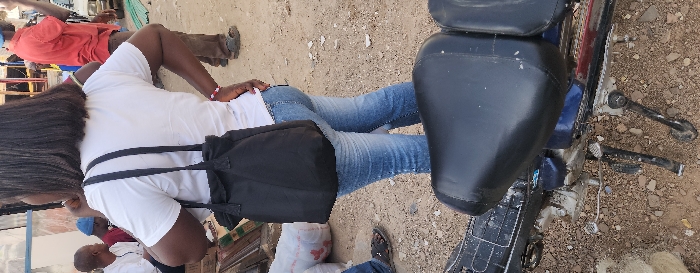 The image depicts an outdoor market or street scene in Jos, Nigeria, characterized by a dusty, unpaved ground surface. The primary subject is a woman observed from the rear-right side, positioned in the middle-ground. She has dark hair, likely styled straight and shoulder-length, partially obscured by her right arm. She wears a plain white short-sleeved t-shirt and light blue denim jeans. A black fabric tote bag with two straps hangs from her left shoulder. Her right hand is placed on her hip, and a red and white beaded bracelet is visible on her right wrist. In the foreground, the rear section of a dark blue or black motorcycle is visible, featuring a worn black two-person seat. The motorcycle's frame and kickstand are discernible, resting on the brown, stony ground. In the background, several individuals are present. To the far right, a man in a red t-shirt and brown trousers stands. To the left, two men are seated, one wearing a white long-sleeved garment and another in a blue cap and a dark top. Partially visible behind them is what appears to be a white sack or bag on the ground. Various market stalls or temporary structures with corrugated metal elements are visible further in the background, suggesting a commercial area. The overall scene indicates a bustling, everyday urban environment.