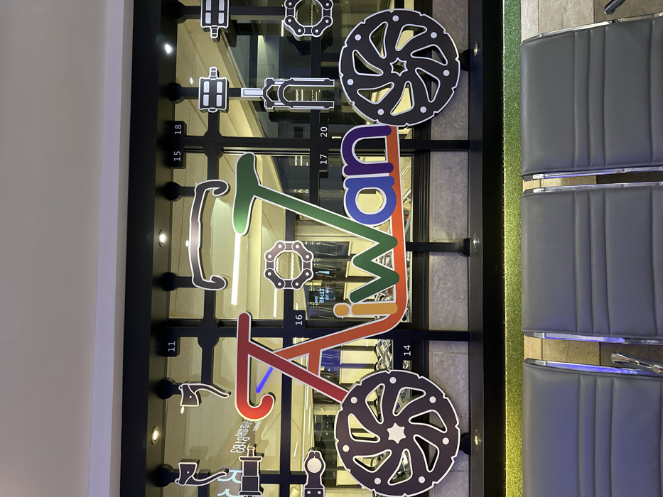 The image depicts an indoor public area in Taoyuan City, Taiwan, featuring a prominent display related to bicycles and the nation