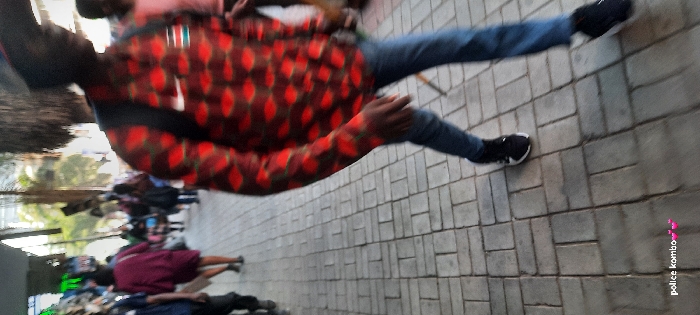 The image depicts a bustling urban pedestrian walkway in Nairobi, Kenya, during daylight hours. In the foreground, a dark-skinned individual, blurred by motion, walks rightward. This person wears a long-sleeved shirt with a red and black geometric pattern, displaying a white Nike swoosh logo and a Kenyan flag emblem on the upper left chest. They are also dressed in blue jeans and black sneakers with white soles, and carry a black backpack. The individual's face is largely obscured by shadow and blur, and they appear to be wearing a dark cap. The ground is paved with grey rectangular paver blocks arranged in a basket-weave pattern. Numerous other individuals, also blurred by movement, populate the mid-ground and background, indicating significant foot traffic. Notably, a person in a reddish-purple dress walks away from the camera on the left side of the path. Commercial activity or stalls are suggested on the left, with a green object visible. Overhead foliage and distant building structures are discernible in the background, typical of a busy commercial street or marketplace in Nairobi.