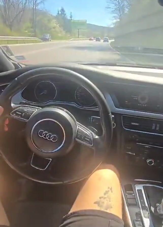 driver's perspective inside an Audi car traveling on a highway during the daytime. The driver's left hand is visible on the steering wheel, and a portion of their leg with a tattoo is in the frame. The dashboard displays vehicle information, and the road ahead shows other cars and roadside scenery with trees and hills under a clear blue sky.