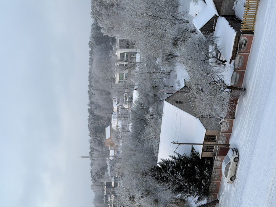 A winter landscape shows houses and trees covered in snow. A forest lines the left side, transitioning to smaller trees interspersed with buildings in the foreground. A house with a snow-covered roof dominates the lower right, next to a car parked along a snow-lined path. Overcast skies complete the scene.