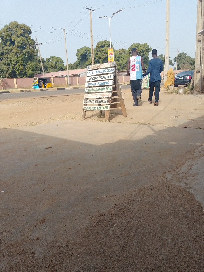 This image depicts an outdoor urban scene in Kaduna, Nigeria, during daytime under a clear sky. In the foreground, a rough dirt surface transitions to cracked concrete. Centered in the midground is a wooden A-frame sign displaying services: "TYPE SETTING/GRAPHIC DESIGN," "COLOUR PRINTING," "SPIRAL BINDING," "SCANNING/LAMINATION," "PROJECT HANDLING," and "COMPUTER TRAINING." To the right of the sign, two males walk away from the viewer. The male on the left wears a light blue and white basketball jersey with "JUDD" and "23" on the back, black baggy pants, and dark shoes. The male on the right wears a dark blue long-sleeved shirt, dark pants, and brown shoes. Behind the sign and individuals, a paved road is visible, bordered by a reddish-brown perimeter wall. A yellow and blue motorized tricycle (Keke Napep) is parked on the left side of the road. Utility poles with overhead lines and a modern solar-powered street light pole are present. In the background, numerous green trees line the horizon, with several low-rise buildings partially visible. Further down the road on the right, a person in yellow attire stands near a dark-colored sedan car.