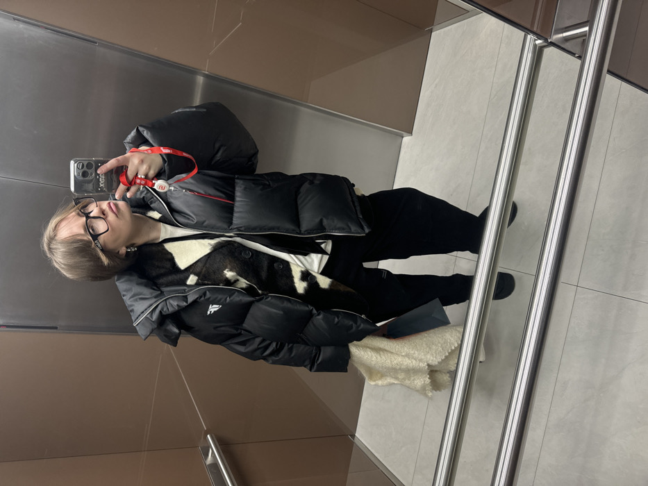 A person takes a selfie in a mirrored elevator. The individual wears black-framed glasses, a white top under a black and white cardigan, and a black puffer jacket with a red lanyard around their neck. They hold a phone with a clear case. The elevator has gray walls and floors, with chrome handrails visible. A white, possibly sherpa-lined, item is also in the reflection.