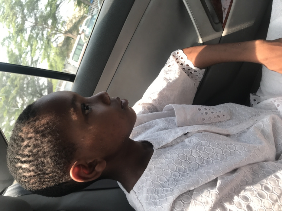 A young person sits in a car, gazing upwards. They are wearing a white, patterned shirt with lace details around the collar and sleeves. Sunlight streams through the car window, highlighting their dark skin and short, patterned hair. The car's interior is visible, including the window frame and a glimpse of trees and a building outside.