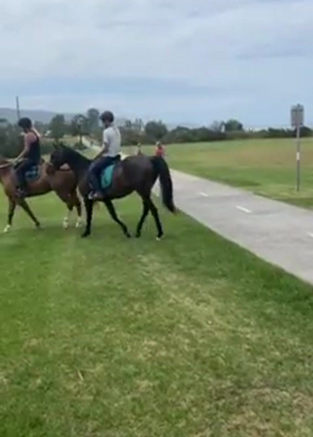 Two people ride horses on a grassy area adjacent to a paved path. The horse on the left is brown, and the horse on the right is dark brown. Two people walk on the paved path in the distance. The path is bordered by green grass. In the background, there are buildings and a body of water. The sky is overcast.