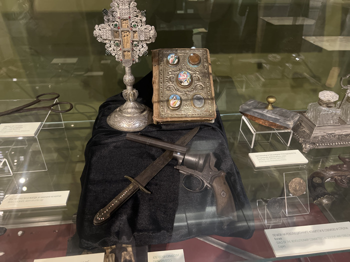 The image displays a collection of historical artifacts presented within a glass museum display case. The scene is located in the **National History Museum in Sofia, Bulgaria**. The central focus is a thematic arrangement on a black velvet cloth: * To the left, a large, ornate silver processional cross, approximately 30-40 cm tall, stands on a flared base. It features intricate filigree work and multiple small, circular enamel or stone inserts, including green and red examples, surrounding central religious figures. * Adjacent to the cross, a bound book with a decorative metallic cover lies flat. The cover is adorned with an embossed border and multiple embedded circular medallions, each depicting miniature portraits, likely religious figures. * Positioned diagonally across the velvet, a single-edged dagger or large knife, approximately 25-30 cm long, features a dark, possibly wooden, handle and a dark metal blade. * Beneath and slightly to the right of the dagger, a dark metallic revolver with a wooden grip is visible. To the right of this central arrangement, on clear acrylic risers, are additional objects: * A rectangular ink blotter with a dark wooden base and a brass knob, resting on an acrylic stand. * An ornate silver-colored tray holding two clear glass inkwells, one with a clear glass stopper. * Further to the right, several circular metallic objects, possibly seals or coins, are displayed on smaller acrylic stands. To the far left of the main display, resting directly on the glass surface, is a pair of old, dark metal pliers or scissors. Multiple white rectangular informational placards are visible within the case, placed on clear acrylic stands. Text on these placards identifies some of the items. One placard directly referencing the central display describes it as "RECONSTRUCTION OF THE SACRED TRIPOD, used when taking an oath in the revolutionary committees by Vasil Levski," and "OATH SYMBOLS." Another placard near the pliers refers to "Pliers for melting bullets." Another placard on the right refers to "SEALS OF THE REVOLUTIONARY COMMITTEES IN NORTHEASTERN BULGARIA." Reflections of the museum interior are visible on the glass surface of the display case. The background wall behind the display is a uniform, muted green color.