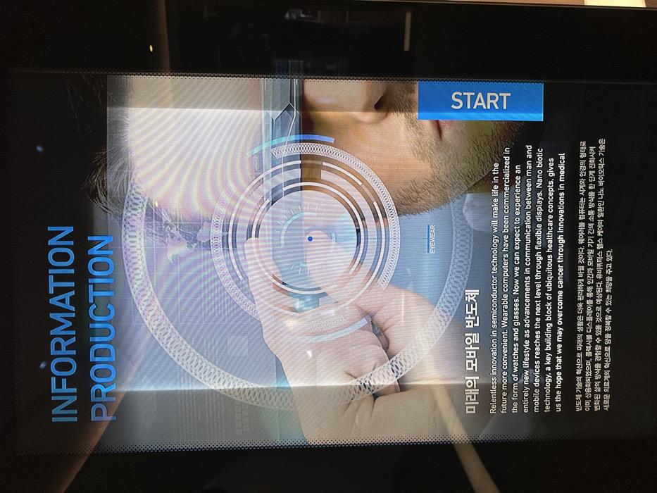 A vertical, illuminated digital display screen is depicted, showcasing content related to technological innovation. The screen features the blue English text "INFORMATION PRODUCTION" at the top. Below this, a male subject's right facial profile, including a beard, is partially visible, wearing futuristic "EYEWEAR." A hand approaches the eyewear from the left. Overlapping the image are translucent blue and white concentric circular graphic elements, a world map, and a central targeting reticle with a blue indicator. Beneath the main visual, a Korean title "미래의 모바일 반도체" (Future Mobile Semiconductor) is displayed. An English paragraph follows, describing "Relentless innovation in semiconductor technology" and "wearable computers" enabling new lifestyles, along with "nano biotic technology" for "overcoming cancer." A corresponding Korean paragraph appears below the English text. On the right side of the display, a vertical blue rectangular button with the white text "START" is present. The display appears to be an interactive exhibit or informational kiosk located within a facility in Suwon-si, South Korea.