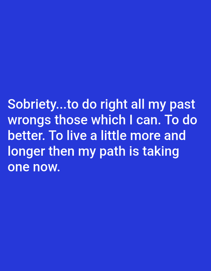 The depicted scene is a digital graphic, contextually located in the city of Park Hill, United States. It features a solid royal blue background. White sans-serif text is displayed, primarily centered vertically in the lower half of the frame. The text reads: "Sobriety...to do right all my past wrongs those which I can. To do better. To live a little more and longer then my path is taking one now." No other subjects, objects, people, or actions are visually present in the image.