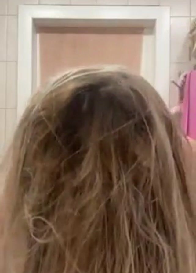 A woman with long blonde hair twists her hair into a bun and looks into the camera, smiling. She is wearing a yellow tank top and a patterned towel is wrapped around her lower body. The background is a bathroom setting with a partially visible door and a few items on a shelf.