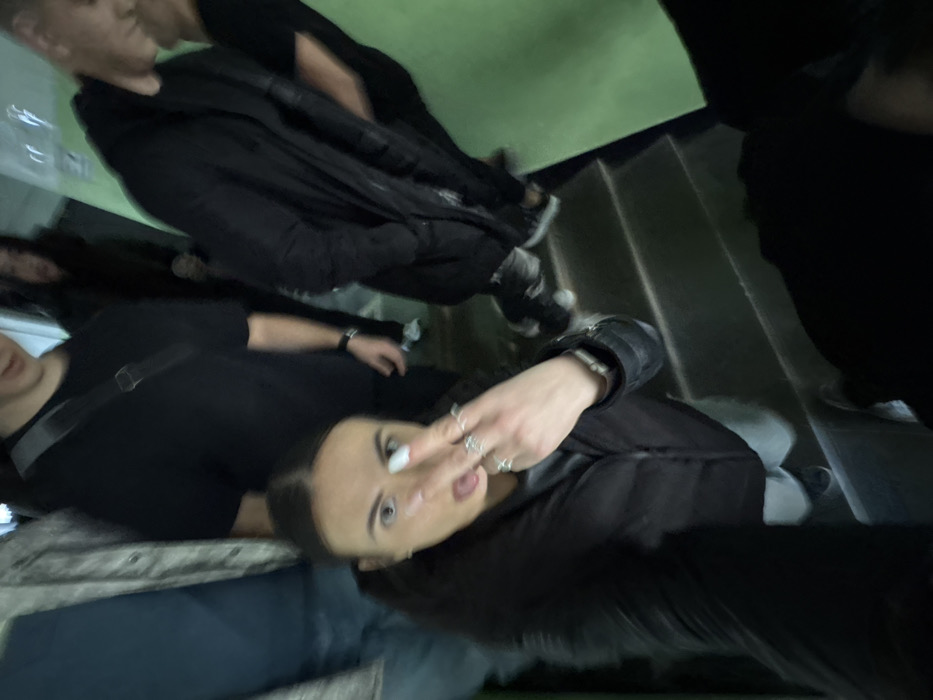 The image depicts an interior, dimly lit, crowded space within the city of Pernik, Bulgaria, specifically appearing to be a stairwell or passage. In the foreground, a female individual, approximately 20-30 years old, with dark hair pulled back, directly faces the viewer. She wears a black puffer jacket over a lighter-colored top. Her right hand is raised, forming a two-finger "V" gesture, and she exhibits multiple rings on her fingers. A silver-toned watch is present on her left wrist. Her tongue is slightly extended. To her left, a partially visible male subject wears a light-colored jacket over a blue garment. Behind the foreground subject, another male individual wears a black t-shirt and a dark shoulder bag, with a watch visible on his left wrist. Further to the right, a heavily blurred male subject in a dark, long coat stands on a set of dark-colored stairs. In the background, a blurred female subject in dark clothing is discernible. The lower-right portion of the image shows an additional blurred, dark form, likely another individual. A distinct light green wall runs vertically along the right side of the image, adjacent to the dark stairs. Significant motion blur is evident throughout the image, particularly in the background, indicating movement or low-light photographic conditions.