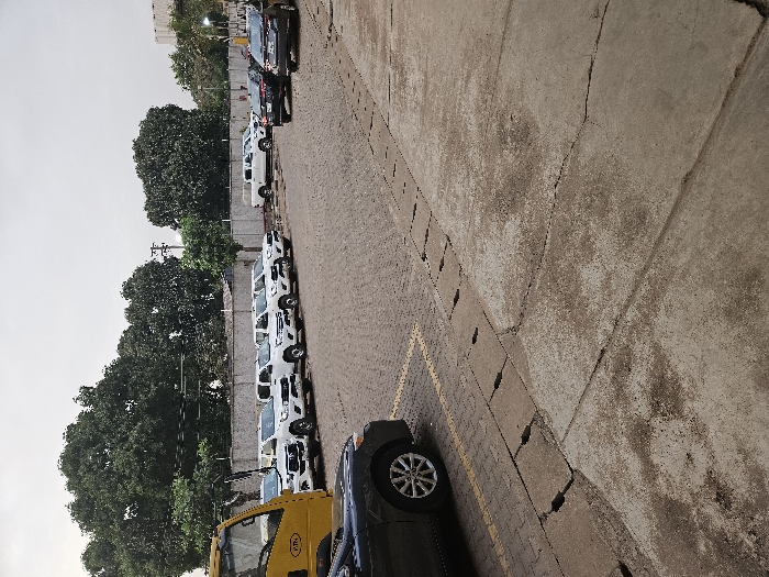 A line of cars and vans stretches along a curb next to a worn concrete surface. The vehicles are mostly white, interspersed with a yellow van and a dark car in the foreground. Lush green trees line the left side of the frame, contrasting with the stark urban environment. The pavement shows signs of age and wear, with cracks and uneven surfaces visible. A yellow line marks a parking boundary.