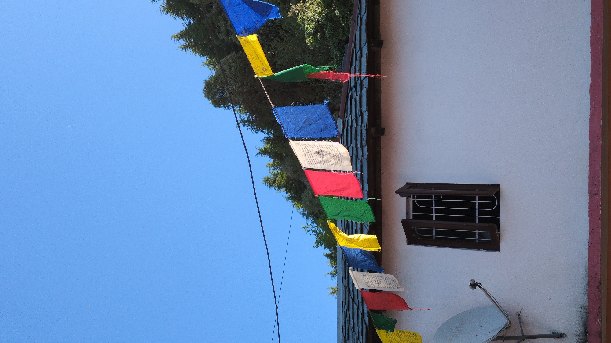 A low-angle outdoor shot shows a side of a white building with a pink trim, a satellite dish mounted on the lower right, and a partially open dark-framed window with metal bars. A string of brightly colored prayer flags are strung diagonally across the upper left of the frame against a clear blue sky and some green trees. The flags are square and arranged in colors including blue, yellow, green, white, and red. The satellite dish has "Airtel" written on it. The scene suggests a location in Haini, India, given the presence of Airtel and the prayer flags.