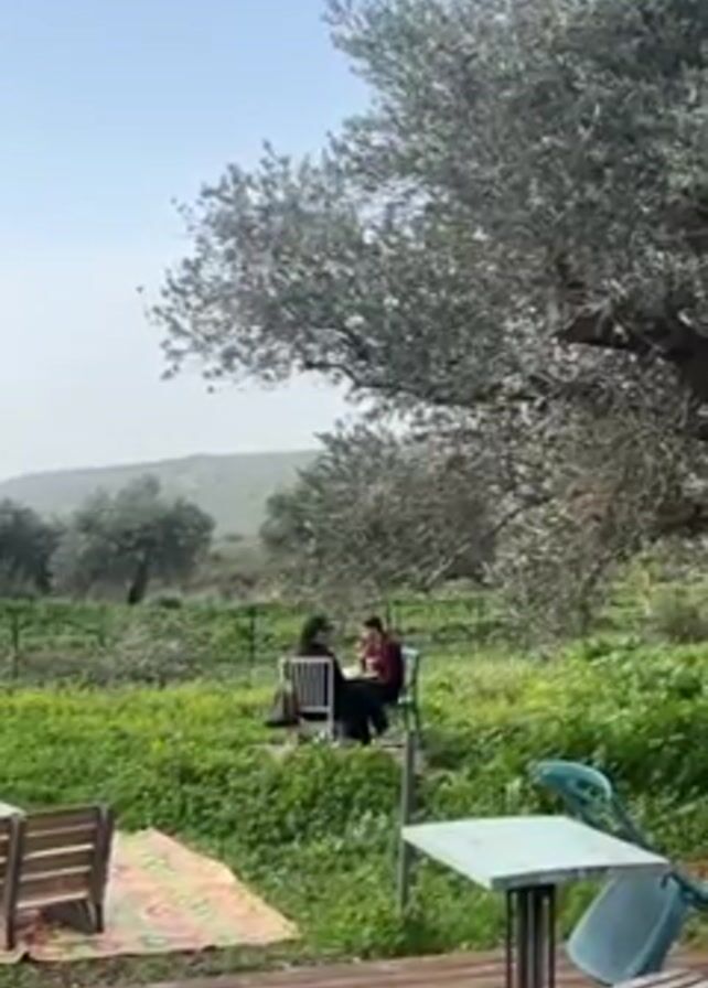 serene outdoor setting with two people seated at a table in a grassy field, partially obscured by an olive tree with silvery-green leaves