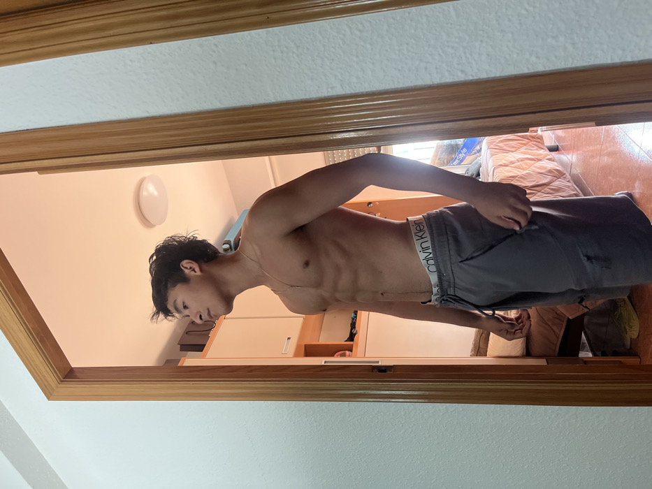 A shirtless, muscular Asian man in gray shorts stands in a doorway