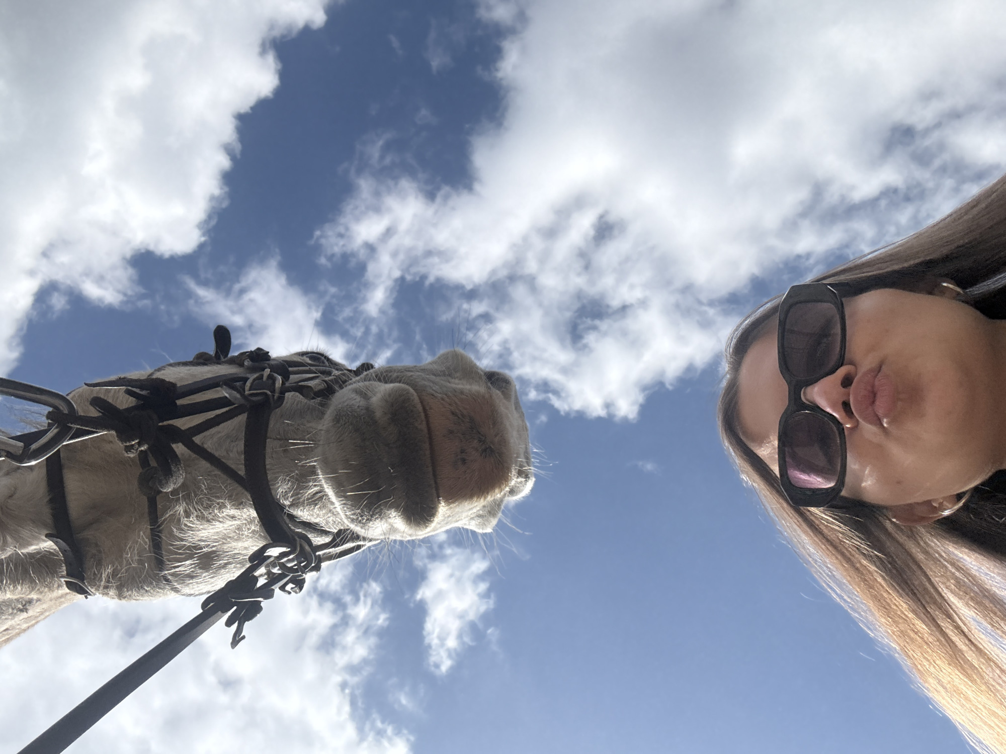 The image presents a low-angle view of a person and a horse against a backdrop of a partly cloudy sky. The person, likely a woman, is positioned on the right side of the frame with her face and sunglasses visible. Her lips are pursed. The horse is on the left, showing its head and harness. The environment appears to be outdoors, with a blue sky. The specific location is Kovachevtsi, Bulgaria.