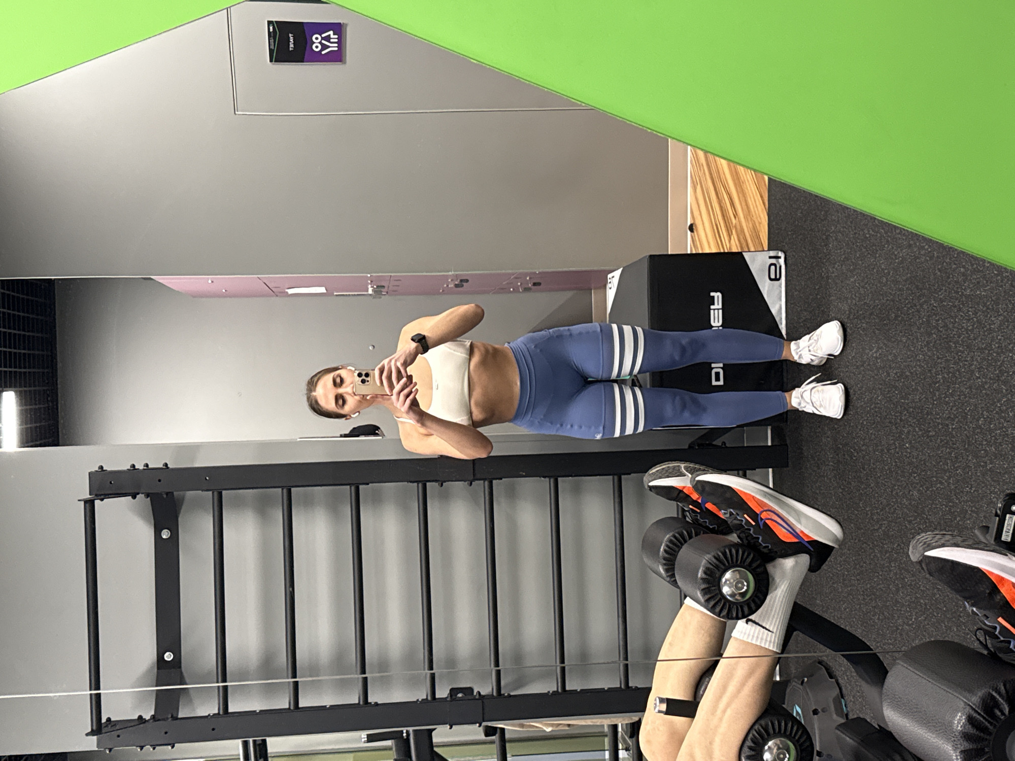 A woman is taking a selfie in a gym. The gym has grey walls, a green ceiling trim, a black wall ladder, and a black box that says "10 lbs" on it. The woman is wearing a white sports bra and blue leggings with white stripes. In the foreground, there is a leg extension machine being used by someone. The location in the city of Lyubertsy, Russia, is not evident in the image.