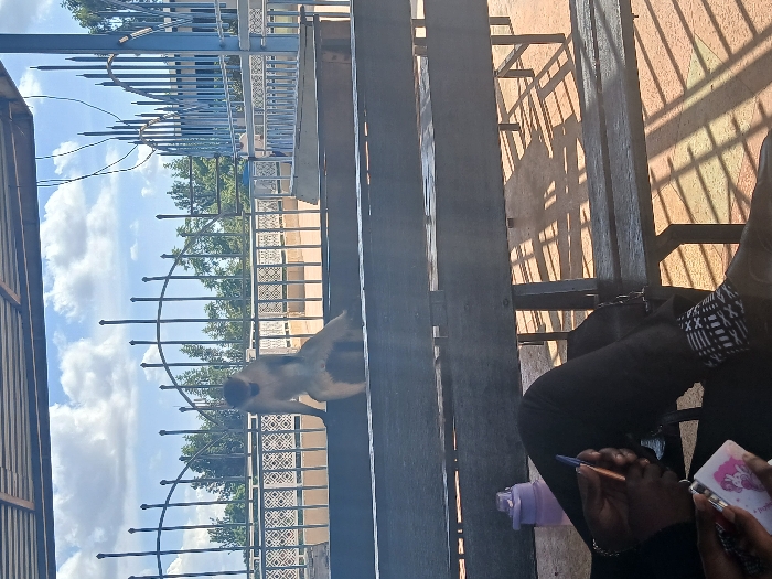 The image captures an outdoor scene under a dark, corrugated roof in the city of Unknown, Unknown. In the immediate foreground, the lower body of an individual is seated, wearing black trousers. The individual's left ankle is adorned with a white and black geometric patterned anklet or sock. The person's hands are visible, holding a blue ballpoint pen in the right hand and a white, possibly electronic, device displaying a pink cartoon character in the left hand. In the mid-ground, a monkey, characterized by its grey-brown fur and darker face/limbs, is perched upright on a dark, horizontal wooden or metal beam, appearing to be part of a seating or railing structure. The monkey faces slightly left. Behind the monkey, a decorative metal fence with a repeating pattern and vertical bars is visible. Further back, a tall, light blue metal gate or fence with multiple vertical spikes curves to the right, with power lines visible above it. The background consists of green trees and foliage under a bright blue sky with scattered white cumulus clouds. A light blue building or structure is partially visible on the far right. The ground in the sunlit areas appears to be paved with light-colored tiles, exhibiting strong, distinct shadows cast by the seating structures and fences, indicating bright daylight conditions. No direct interaction is observed between the person and the monkey.