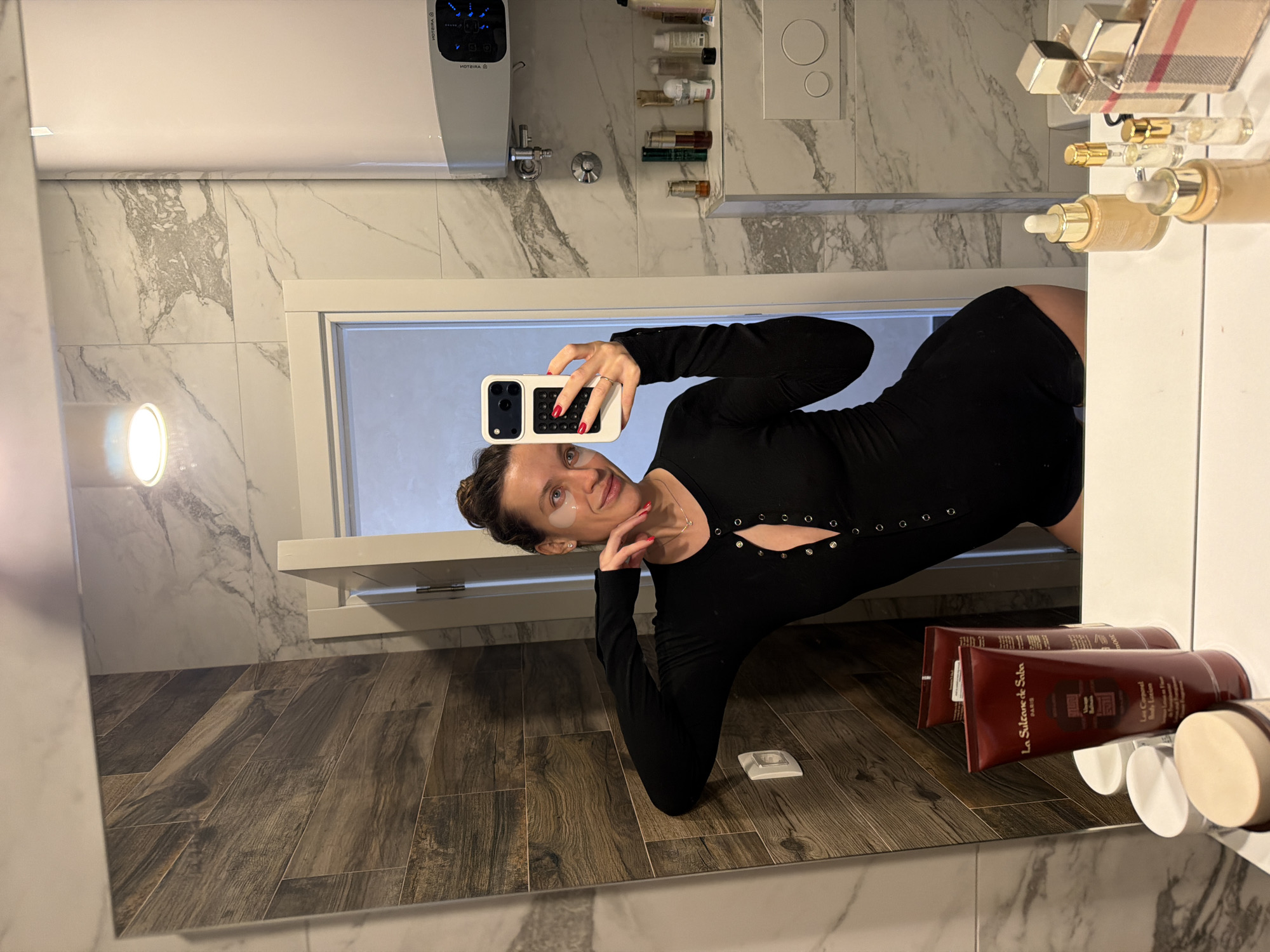 A mirror selfie is taken inside an unidentified bathroom in Budva, Montenegro. The bathroom features marble walls and wood-look tile flooring. On the wall behind the person, there is a water heater and a set of shelves holding toiletries. The vanity to the right holds various cosmetics and skincare items, including tubes labeled "La Sultane de Saba" and several bottles of perfume. The person in the photo is wearing a black long-sleeve dress with snap details at the neckline, and they have eye patches under their eyes. They are holding a cell phone with a white case and taking the selfie.