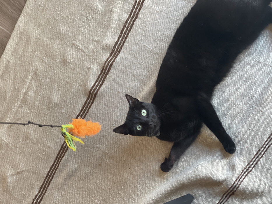 - "A black domestic cat with prominent green eyes and a visible collar is depicted lying on a light beige woven rug" by FM-2mvR12, licensed under CC BY 4.0
