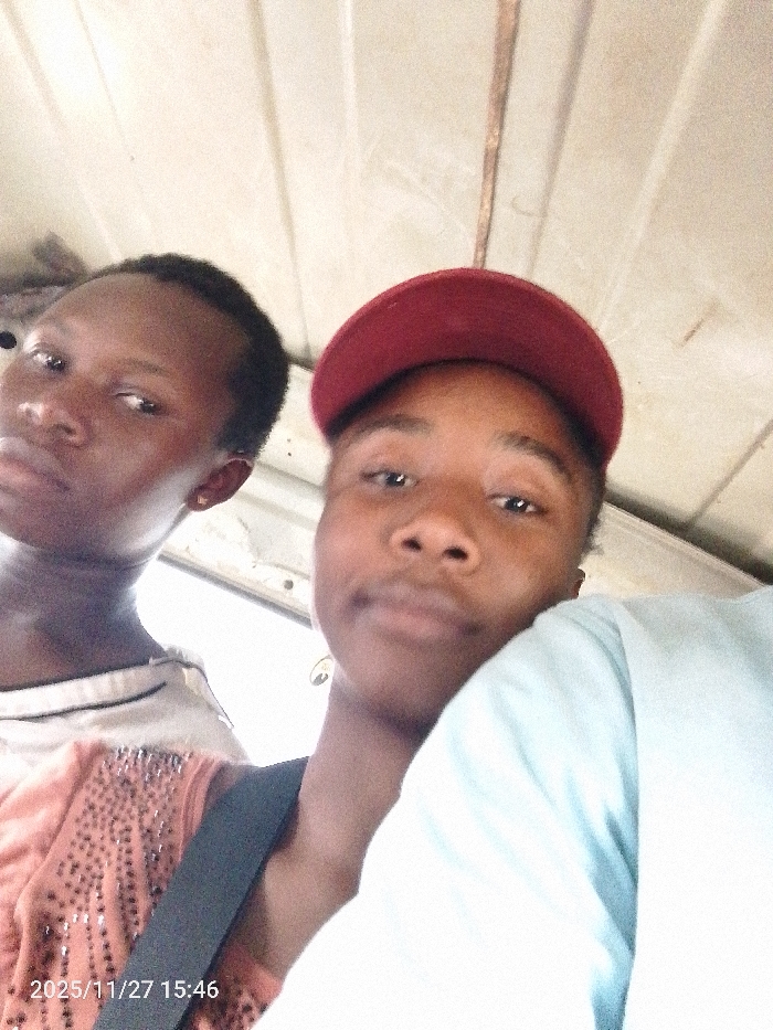 The image, captured on 2025/11/27 at 15:46, displays two young individuals of dark complexion within the interior of a commercial passenger vehicle. The overhead background consists of light-colored, corrugated metal or plastic paneling, consistent with a "danfo" bus or similar public transport vehicle commonly found in Lagos, Nigeria. The specific location within Lagos is not discernible from the image. The individual on the left has short, dark hair and wears a multi-layered top consisting of a light-colored undershirt beneath an orange or peach-colored garment with a textured, possibly embellished, pattern across the chest. A small, light-colored stud earring is visible in his left ear. His gaze is directed towards the camera with a neutral expression. The individual on the right wears a dark red baseball cap and a light blue short-sleeved shirt. A dark-colored strap, likely from a bag or a vehicle safety restraint, crosses his upper left torso. His facial expression is neutral, with a slight upward curve to his lips. Both subjects are positioned closely together, facing the camera, indicating a selfie-style photograph taken from a low angle.
