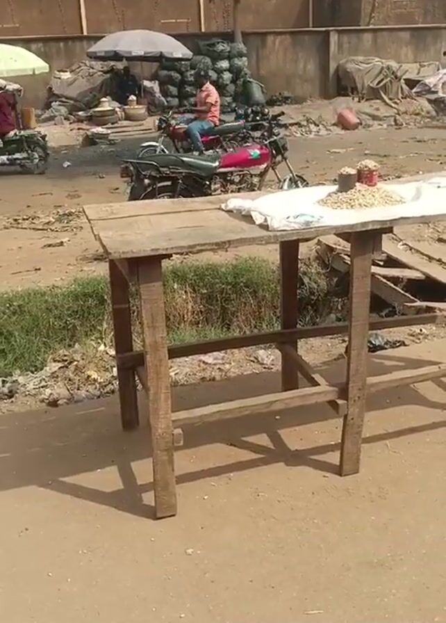 The scene is an outdoor street view during the day. The ground is a light brown dirt or pavement. In the foreground, a simple, wooden table stands, partially covered with a white cloth. On the table, there's a scattering of what appear to be peanuts. Behind the table, there's a strip of vegetation or grass. Further back, several motorcycles are parked. Some are ridden by people. In the background, several market stalls can be seen with people standing around them. There are also large, dark bags piled in one area. Buildings form the backdrop, with a tall tree behind the pile of bags. A person walks on the left side of the frame, carrying a large object on their head. The scene suggests a market area in a developing country.