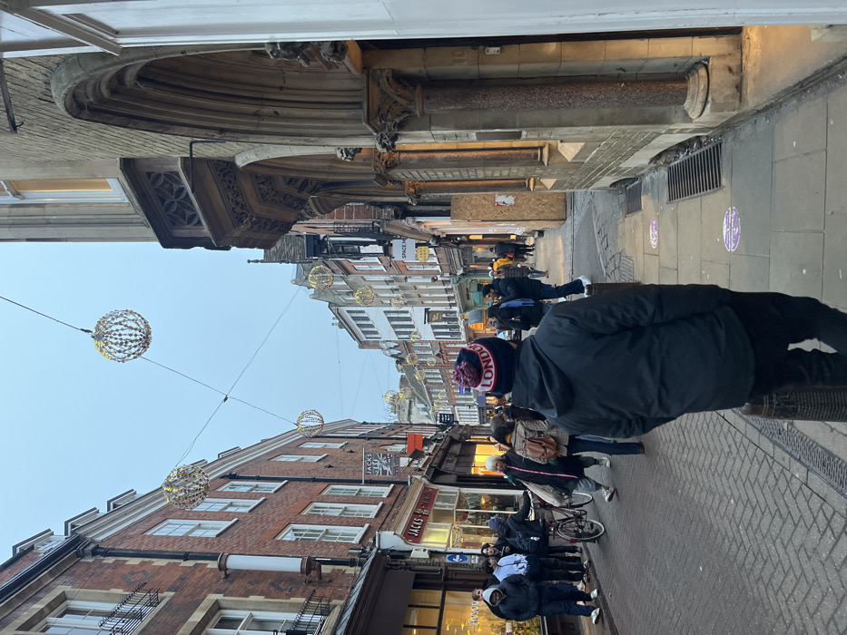 A bustling street scene, viewed from a low angle, reveals a narrow lane filled with pedestrians. Buildings with brick facades and prominent windows line the street. Ornamental light fixtures hang overhead, adding a festive touch. The street surface is paved with patterned bricks. A person in a dark jacket and a "London" hat partially obstructs the view. Ornate architectural details crown the tops of some buildings.