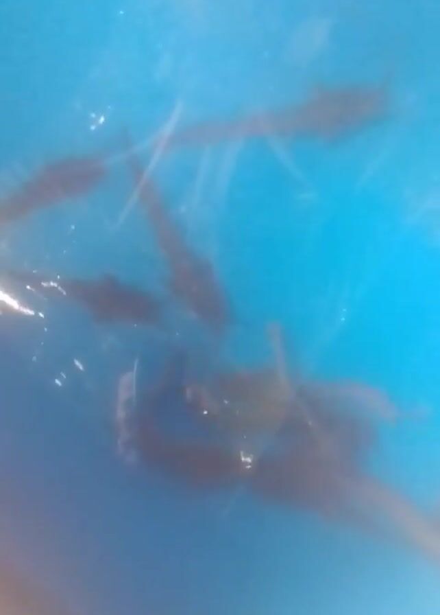several dark, slender fish swimming in blue-tinted water within a container. The water is somewhat murky, obscuring fine details of the fish. There are also some thin, translucent strands or debris floating in the water.