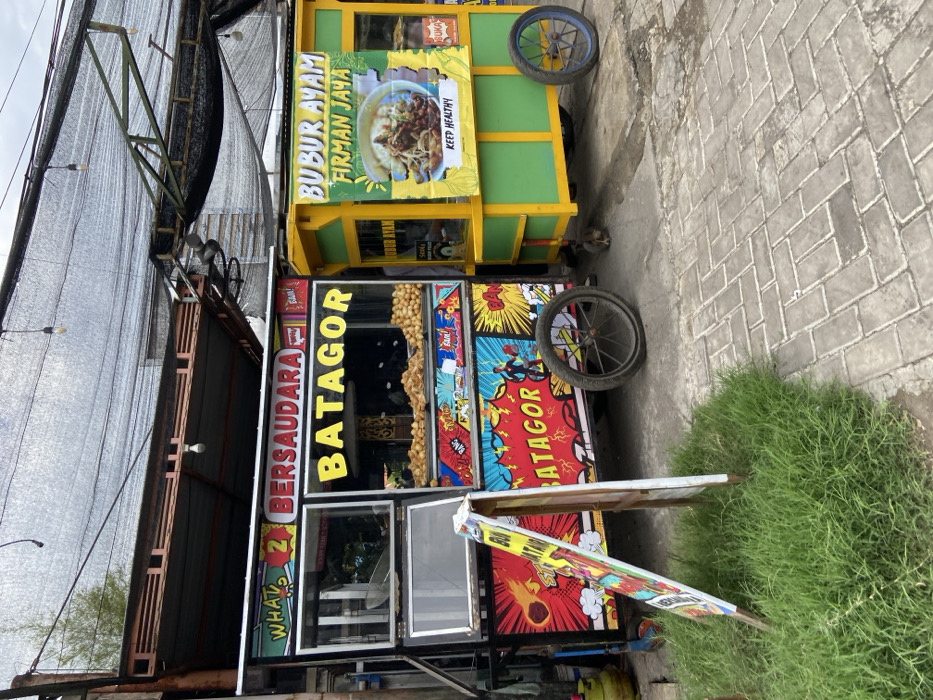- "This image depicts a street food vendor setup in Balonggabus, Indonesia, featuring two mobile food carts positioned on a grey paver surface adjacent to a patch of green grass" by FM-htxI33, licensed under CC BY 4.0