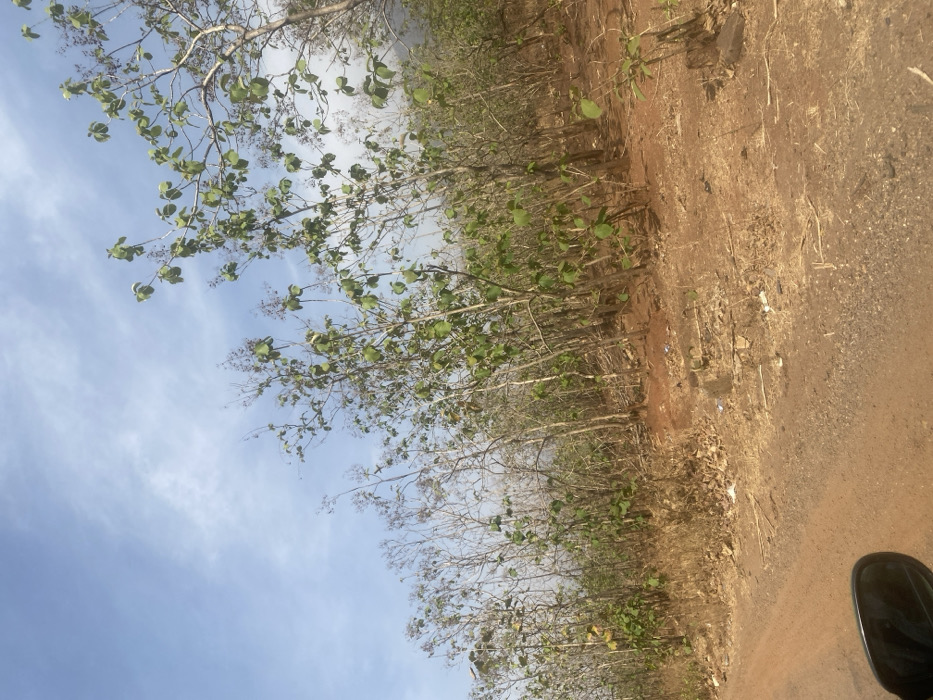 The image depicts an unpopulated rural or semi-rural landscape in Gidan Waya, Nigeria, under a blue sky with scattered white cirrus clouds