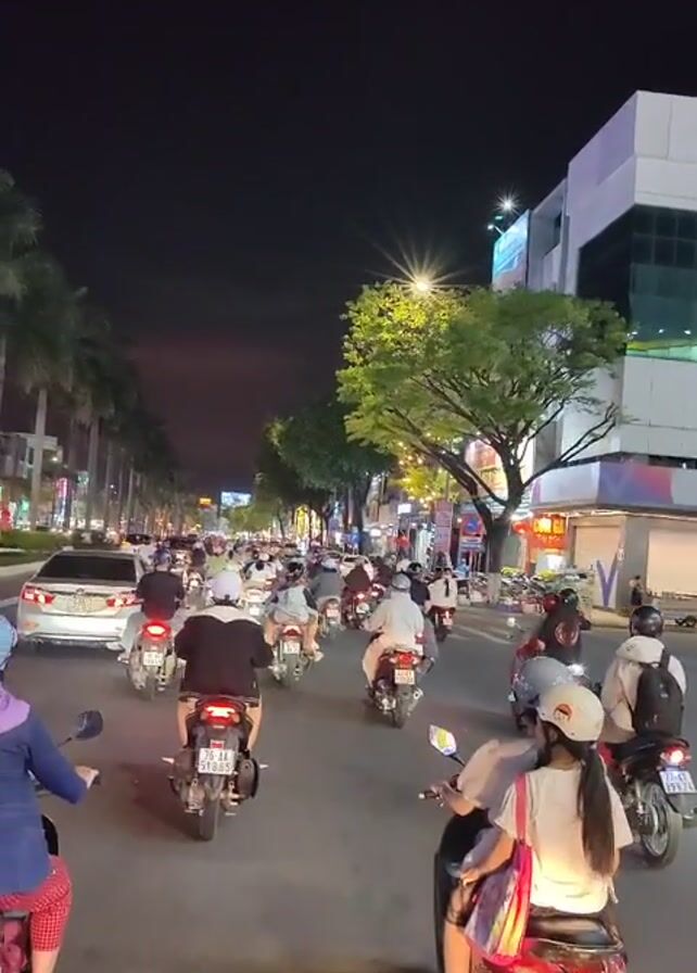 street in Vietnam at night, with many motorbikes driving along a busy road