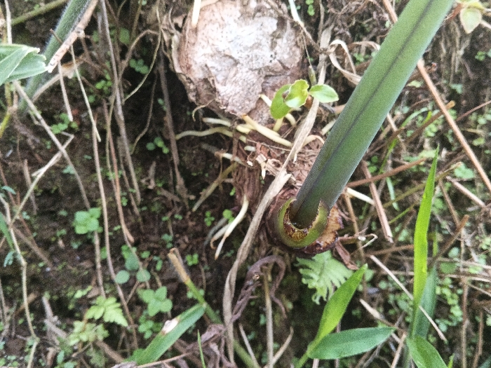 The scene is a ground-level, close-up view of botanical elements within a natural environment in Banteay Srei, Cambodia. A prominent, dark green cylindrical plant stem, approximately 1-2 cm in diameter, extends diagonally from the lower-center towards the upper-right. Its base, at the soil line, is dark brown with visible fibrous textures. To the immediate left of the stem's base, a light brown, irregularly shaped plant structure, consistent with a rhizome or bulb, is partially exposed. Multiple thin, off-white roots emanate from this structure and penetrate the dark, moist-looking soil. The surrounding ground consists of dark, granular soil interspersed with various smaller plant forms, including scattered patches of small-leafed green ground cover, thin dry brown stalks, and several blades of vibrant green grass, one notably distinct in the lower-right foreground. A singular young sprout, featuring two small, light green cotyledons, is visible near the upper-center, rooted close to the exposed rhizome. No human subjects, artificial objects, or observable actions are present within the frame.
