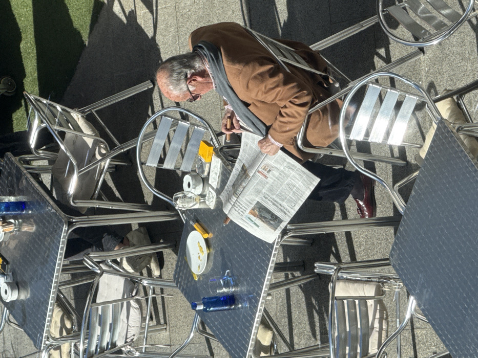 An elevated view captures an outdoor cafe scene in les Escaldes, Andorra, under bright sunlight, evidenced by sharp shadows. The primary subject is an elderly male seated at a square, textured metallic table. He has balding white hair, wears sunglasses, a light brown jacket, a grey scarf, dark trousers, and dark red loafers. He is actively reading a folded newspaper, holding it with both hands. On the man's table, from left to right, are a small blue glass bottle, a clear glass, a small white ceramic dish containing a few yellow remnants, a yellow cylindrical object, a white coaster, a clear stemmed glass (possibly wine), a metallic ashtray with cigarette butts, and an open yellow cigarette pack. The newspaper rests between these items and the man's hands. The surrounding environment consists of similar square metallic tables and chairs, some equipped with light-colored seat cushions. Another metallic table, partially visible in the upper frame, holds additional blue bottles and glasses. In the background, the ground surface appears to be paved light grey stone or concrete, with a distinct patch of artificial green turf visible on the right. The legs of another individual, wearing light-colored trousers and white shoes, are visible beneath a table in the upper left background. A dark object with wheels is faintly visible in the far upper right background.