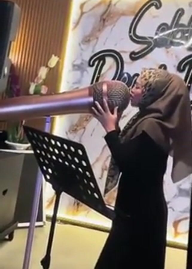 A woman wearing a hijab is singing into a very large microphone, which is pink, in what appears to be a karaoke bar or restaurant