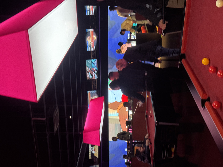 People play pool in a dimly lit entertainment venue. Several pool tables with red felt are in the foreground. Multiple screens display a cartoon or other media. A pink and white light fixture hangs from the ceiling. Some of the patrons appear to be in the midst of a game.