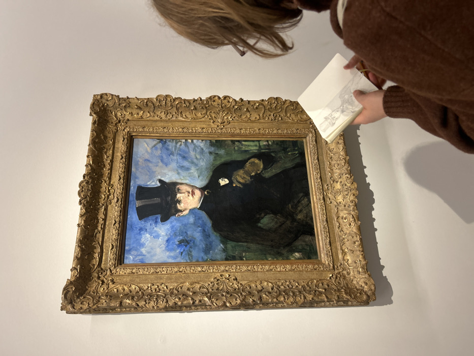 An individual is depicted from a rear-right perspective, sketching a painting displayed on a light-colored wall within the Thyssen-Bornemisza Museum in Madrid, Spain. The prominent artwork is Édouard Manet's "Young Lady in 1866," an oil painting featuring a female figure in a black riding habit, white gloves, and a black top hat, holding a white flower. The painting is presented in an ornate, gold-colored frame, against an impressionistic background of blue and green. The person, with medium-length reddish-brown hair and wearing a brown knitted garment, holds a small open white sketchbook containing a pencil drawing resembling the painting's subject, indicating active artistic engagement with the artwork. The museum wall is plain, and ambient lighting illuminates the scene.