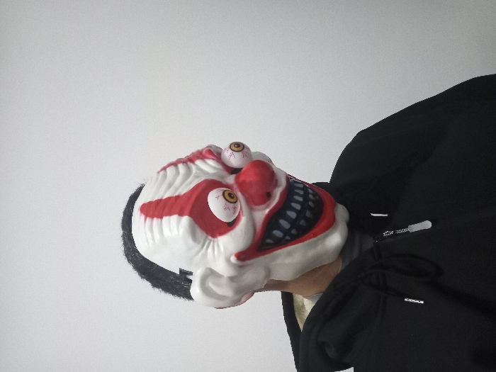 A person wears a white clown mask with red accents and bulging eyes. The mask has black hair around the sides. They wear a black jacket. The background is plain white. The image appears to be taken from a low angle and the image is rotated slightly.
