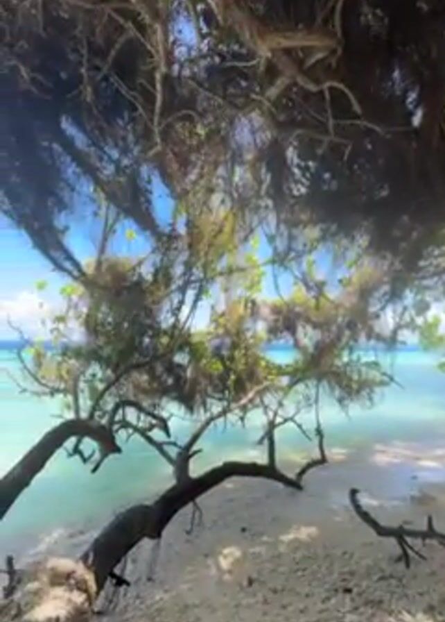 The camera pans across a tropical beach. The foreground is filled with the branches and roots of a tree providing a natural frame for the scene. The ground is covered with white sand, and in the distance, the turquoise ocean stretches out to the horizon under a blue sky with fluffy white clouds. The branches are sparse, and the leaves are green, offering glimpses of the water. The overall tone is peaceful and serene, showcasing the natural beauty of a tropical beach.