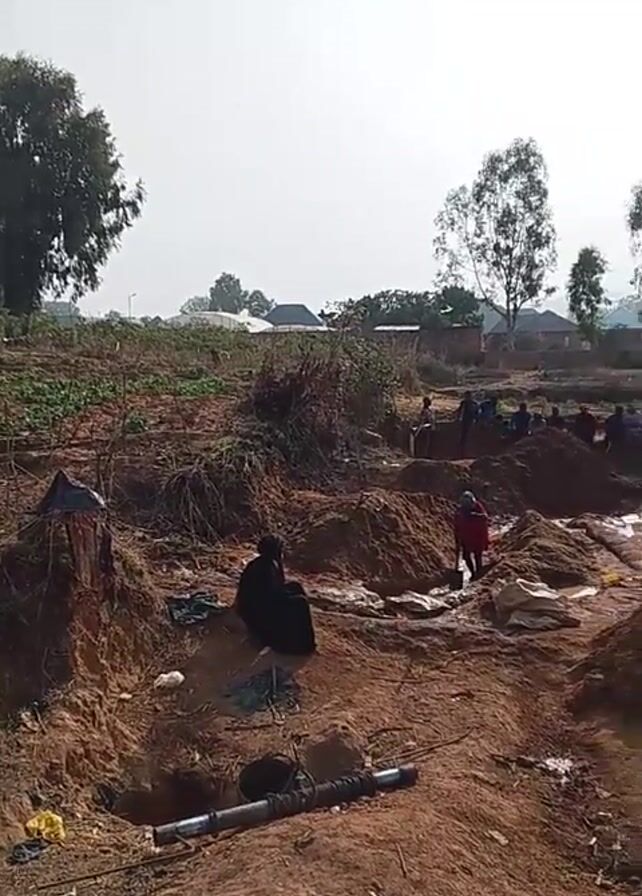 group of people working in a field. The ground is mostly bare earth, with some patches of vegetation and small trees. There are several piles of dirt and what appear to be bags scattered around the area. Some of the people are standing or walking around the dirt piles, while others appear to be digging. There are also some long metal pipes lying on the ground. In the background, there are some houses and more trees. The sky is overcast and bright.