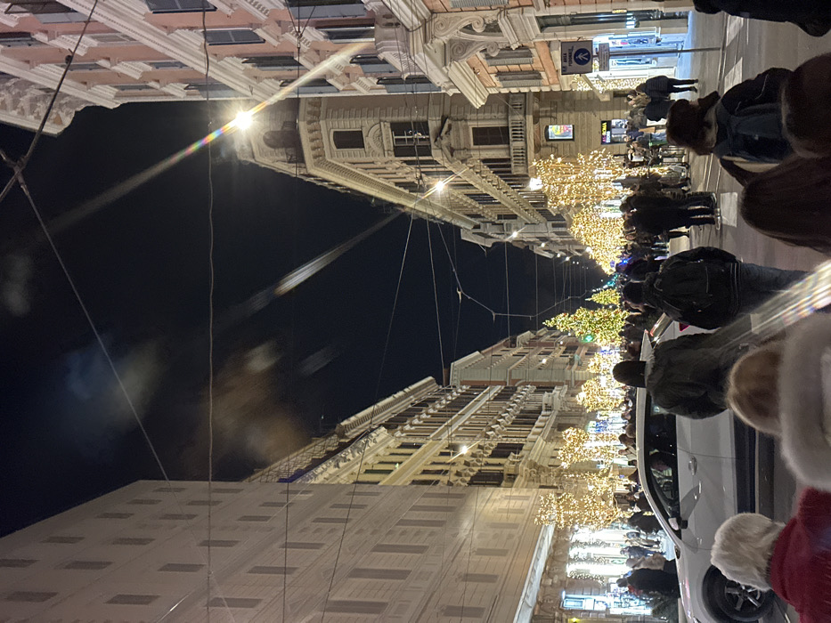 An urban night scene presents a street illuminated with festive lights, possibly for Christmas. Tall buildings line both sides, adorned with elaborate architectural details. People stroll along the decorated street. A white car is parked at the street's edge. Overhead, wires crisscross the open sky between the buildings. The photo is vertically oriented.