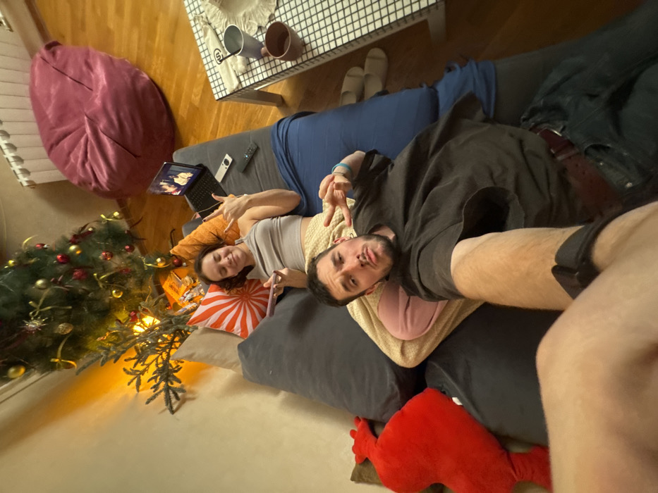 A couple is lying on a grey couch, posing for a selfie. A Christmas tree adorned with lights and ornaments stands nearby. A laptop rests on the couch beside the woman. A pink beanbag chair sits in the background. A coffee table with cups is visible in the upper portion of the shot. A red plush toy lies on the couch.
